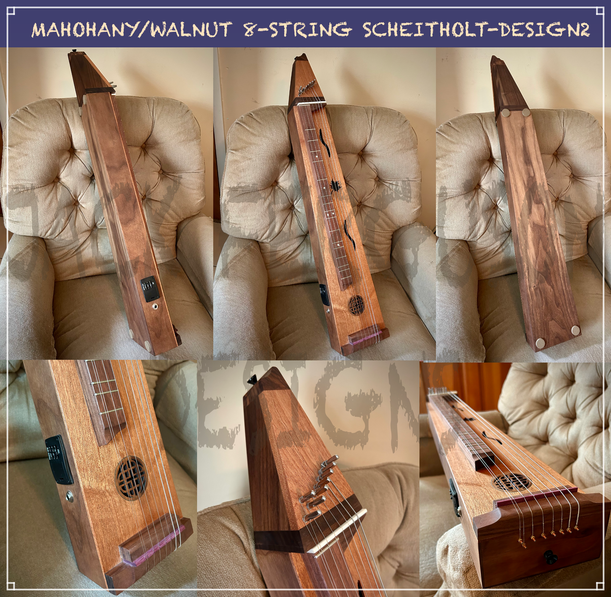 Ancestor to the American Appalachian Mountain Dulcimer, my Scheitholt designs offer eight strings, four fretted, and four drone, over a standard dulcimer diatonic fretboard. The fretted strings are standard gauge tuned DAdd, and the drones are standard gauge also tuned DAdd. The drones can be heavier gauge with desired tunings to provide more depth in sound.