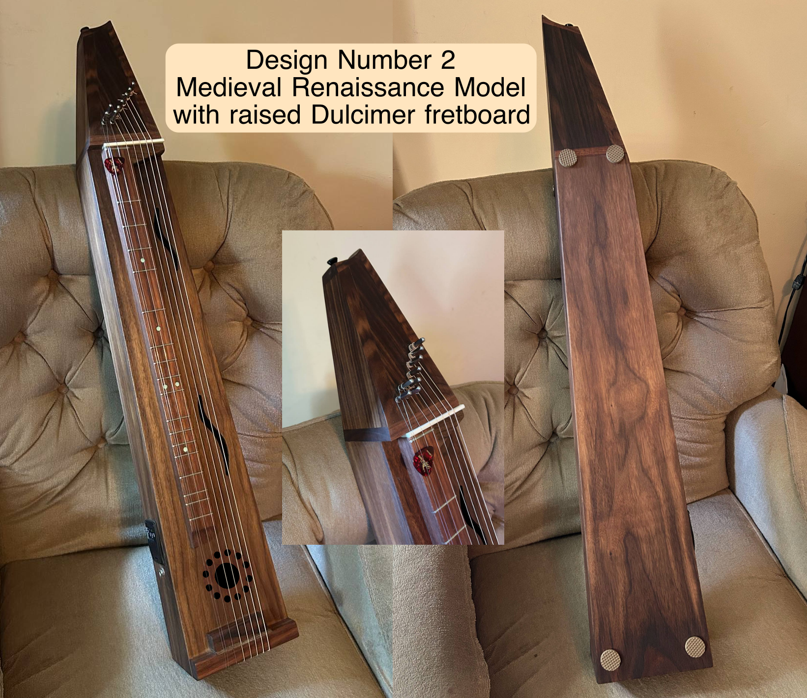 Zither pins, like the ones used on an autoharp, are used for tuning. My scheitholts, Design1 and Design2, can be played from the lap, like a standard dulcimer, or from the table-top. Padded feet are attached to the back for table-top play. Additional soundholes available.