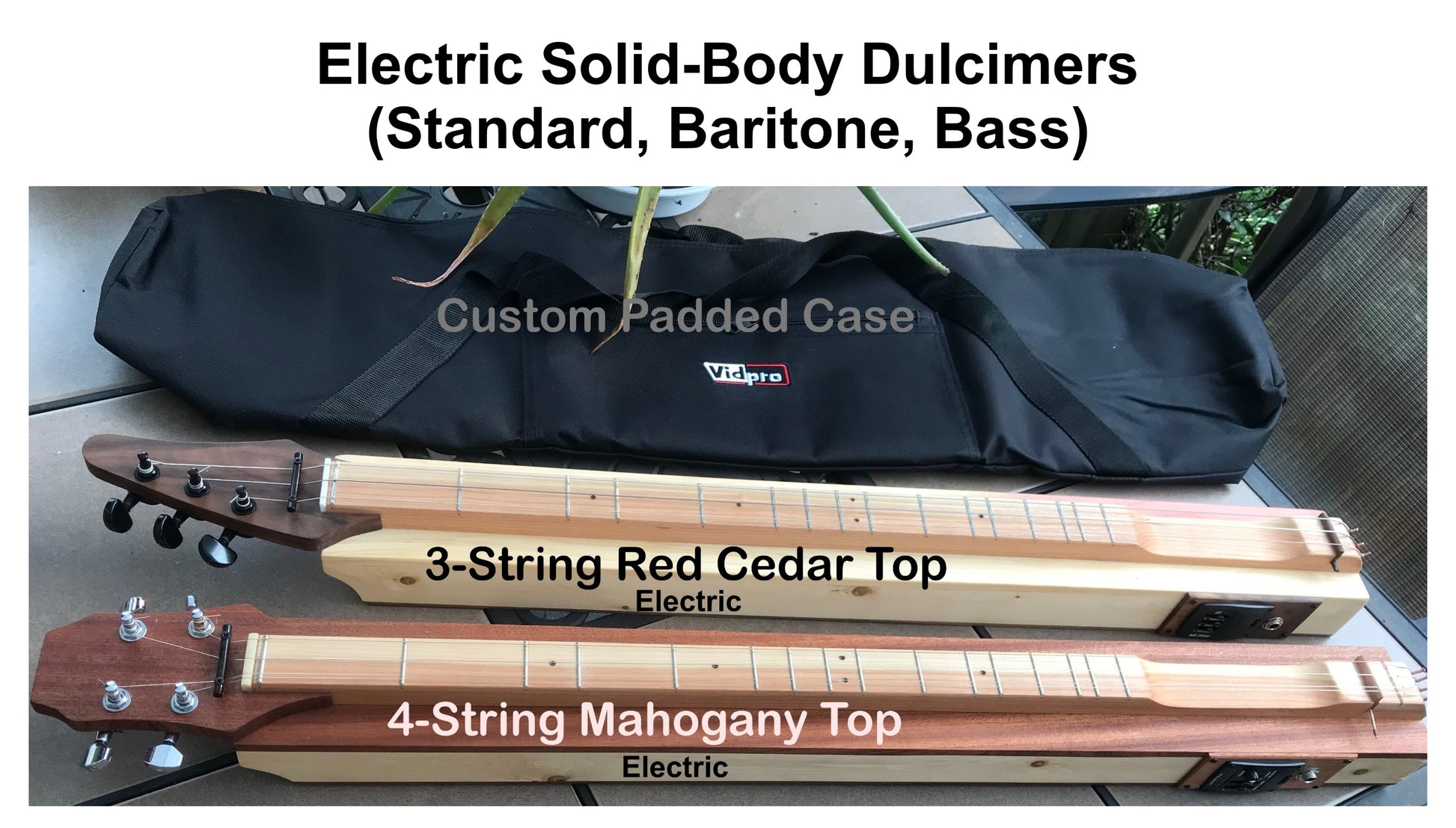 Solid-body electric dulcimer made with light-weight Fir 2x4 body, walnut back, and dogwood top and head. Three-string flat guitar-style head. Three-band active belcat preamp with piezo under-bridge bar mic. Includes custom soft case
