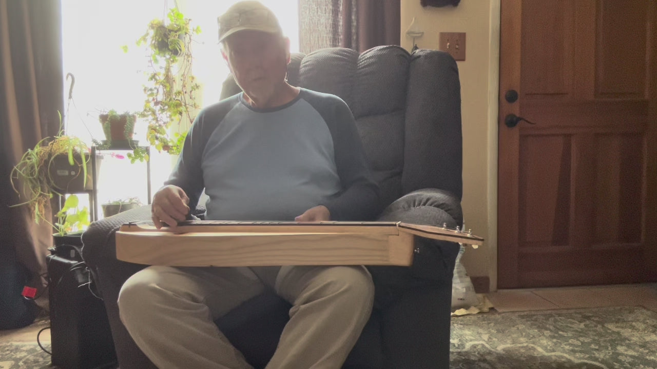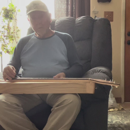 Beautiful Catalpa Teardrop dulcimer with three-string guitar-style tuning head. Includes custom soft case. Optional electric.